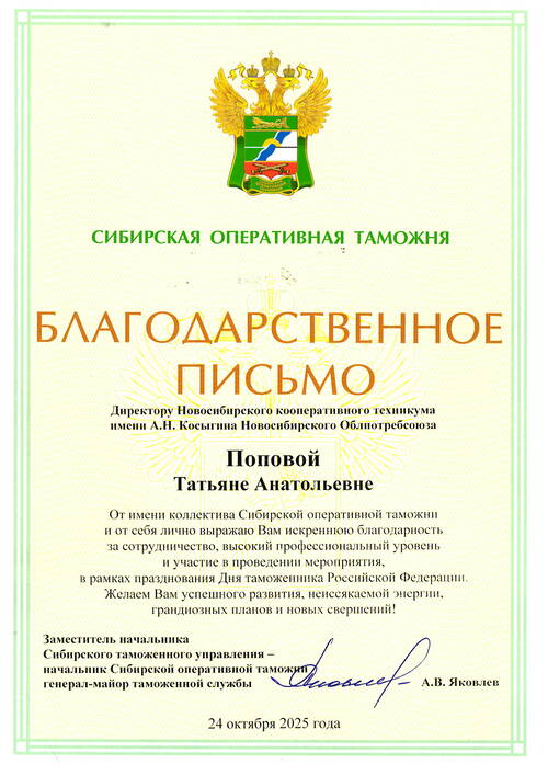 Мы гордимся многолетним сотрудничеством, которое связывает наш техникум с Сибирским таможенным управлением с 1994 года. Совместные образовательные программы, практики и встречи специалистов ведомства со студентами способствуют подготовке компетентных и ответственных специалистов. Желаем вам дальнейших успехов в службе, крепкого здоровья, профессиональных достижений и благополучия!!! Пусть ваш труд всегда будет отмечен уважением и признанием общества. С праздником!!!