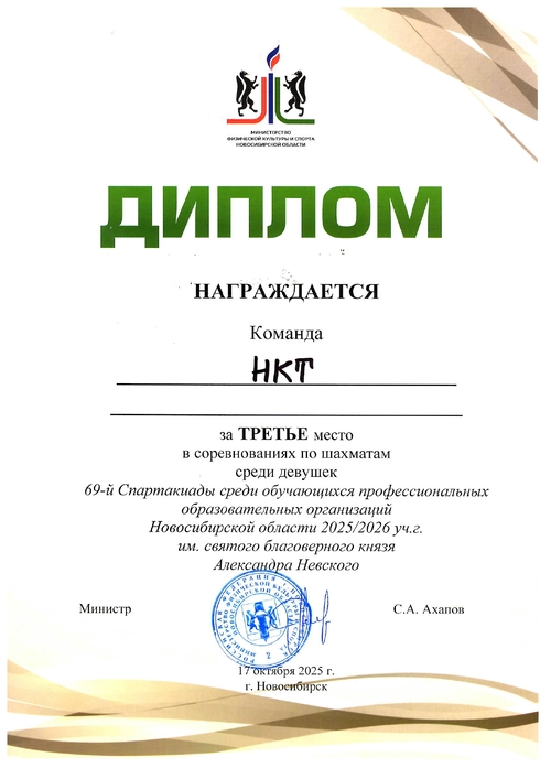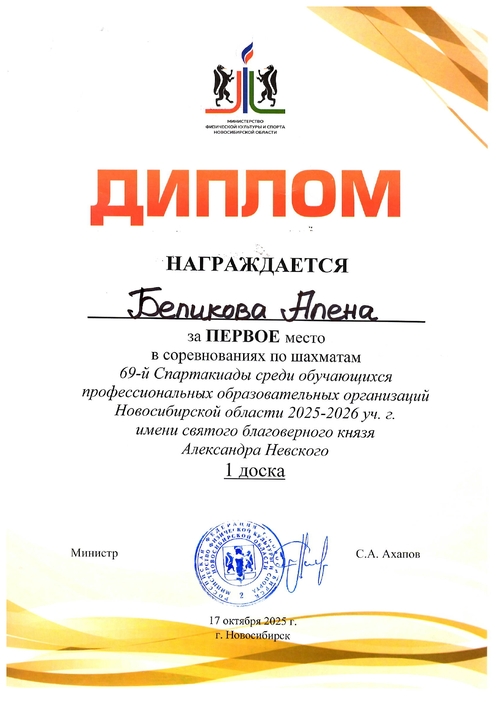 Шахматный клуб «Белая Ладья» Новосибирского кооперативного техникума имени А.Н. Косыгина Новосибирского облпотребсоюза заявил о себе на 69-й спартакиаде г. Новосибирска имени святого благоверного князя Александра Невского среди профессиональных образовательных организаций.
