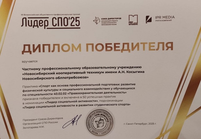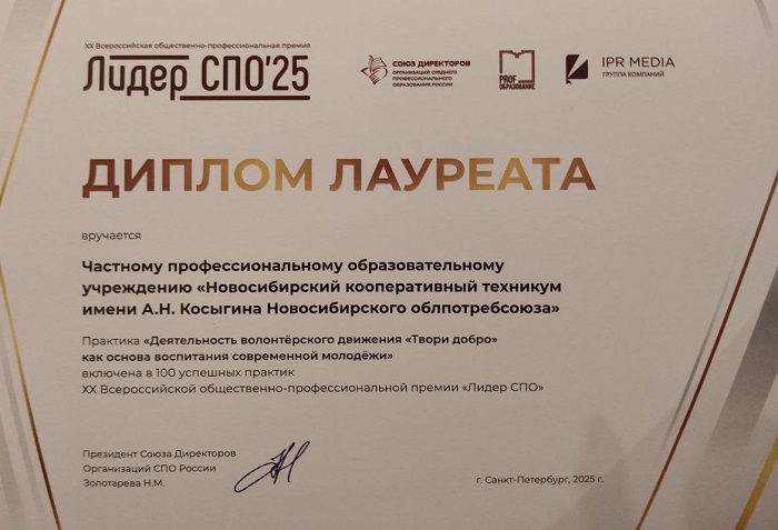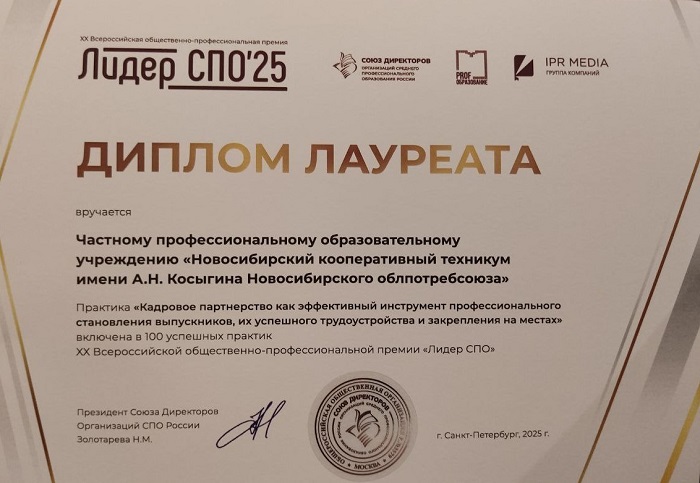 Новосибирский кооперативный техникум имени А.Н. Косыгина Новосибирского облпотребсоюза принял участие в церемонии награждения победителей и призеров XX общественно-профессиональной премии «Лидер СПО», направленной на выявление и поощрение лучших практик и достижений организаций среднего профессионального образования Российской Федерации.