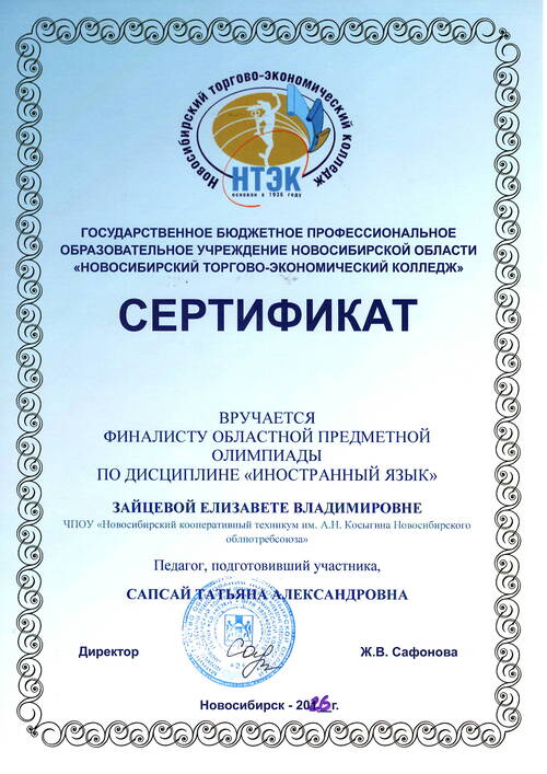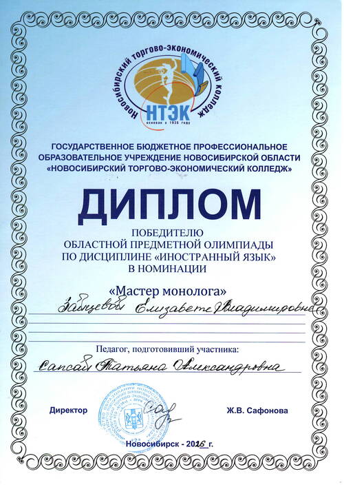 По результатам олимпиады студенткам были вручены сертификаты финалистов областной предметной олимпиады, а Елизавета также была отмечена дипломом победителя в номинации «Мастер монолога».