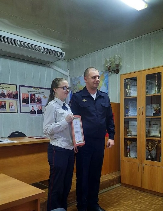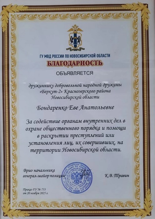 И.о. начальника полиции, подполковник полиции МО МВД России «Краснозерский» Д.В. Гольцман передал Еве благодарность от Врио начальника генерал-майора полиции ГУ МВД России по Новосибирской области К.В. Травина за содействие органам внутренних дел в охране общественного порядка и помощи в раскрытии преступлений или установлении лиц, их совершивших, на территории Новосибирской области.